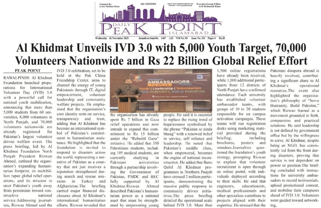 صحافیوں سے گفتگو کرتے ہوئے رضوان احمد نے بتایا کہ IVD 3.0 کا مقصد پاکستانی نوجوانوں کی توانائی کو آئی ٹی، ڈیجیٹل اسکلز، وولنٹیر لیڈرشپ اور کمیونٹی ویلفیئر منصوبوں کے ذریعے صحیح سمت دینا ہے۔ انہوں نے کہا کہ الخدمت کی پہچان خدمت، شفافیت اور اعتماد پر قائم ہے اور ادارہ عالمی سطح پر پاکستان کی انسانیت دوستی کی علامت بن چکا ہے۔ ان کا کہنا تھا کہ دنیا بھر میں آنے والی آفات میں الخدمت کو مدعو کیا جاتا ہے، اور ترکی و افغانستان میں سرچ اینڈ ریسکیو مشنز کے دوران پاکستان کی ساکھ مضبوط ہوئی۔