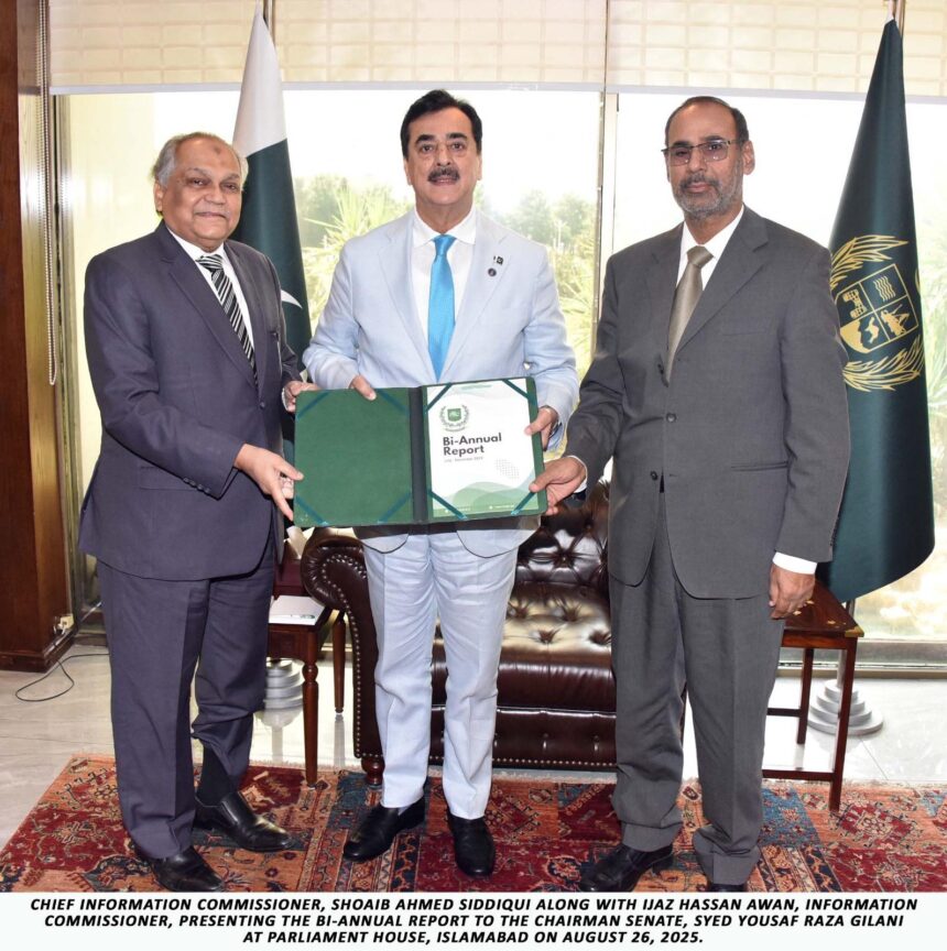 چیف انفارمیشن کمشنر شعیب احمد صدیقی اور انفارمیشن کمشنر اعجاز حسن اعوان نے پارلیمنٹ ہاؤس اسلام آباد میں چیئرمین سینیٹ سید یوسف رضا گیلانی کو چھ ماہی رپورٹ پیش کی۔ اس موقع پر چیئرمین سینیٹ کو کمیشن کی کارکردگی اور عوام کو معلومات کی فراہمی کے حوالے سے اٹھائے گئے اقدامات سے آگاہ کیا گیا۔ رپورٹ میں شفافیت، معلومات تک رسائی اور ادارہ جاتی بہتری کے لیے کمیشن کی کوششوں پر روشنی ڈالی گئی۔ چیئرمین سینیٹ یوسف رضا گیلانی نے رپورٹ پیش کرنے پر کمشنرز کا شکریہ ادا کیا اور امید ظاہر کی کہ مستقبل میں عوام کو معلومات کی فراہمی کے عمل میں مزید بہتری آئے گی۔
