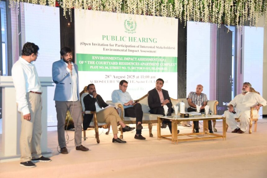 اسلام آباد کے سیکٹر ایف-11/1 میں باون منزلہ رہائشی منصوبے "دی کورٹیارڈ ریزیڈنسز اپارٹمنٹ کمپلیکس” کے ماحولیاتی اثرات کی رپورٹ (ای آئی اے) پر عوامی سماعت منعقد ہوئی۔ اس سماعت میں فضائی معیار، شور، ٹریفک کی بھیڑ، ٹھوس کچرے کی پیداوار اور حیاتیاتی تنوع پر ممکنہ اثرات جیسے اہم ماحولیاتی خدشات زیربحث آئے۔