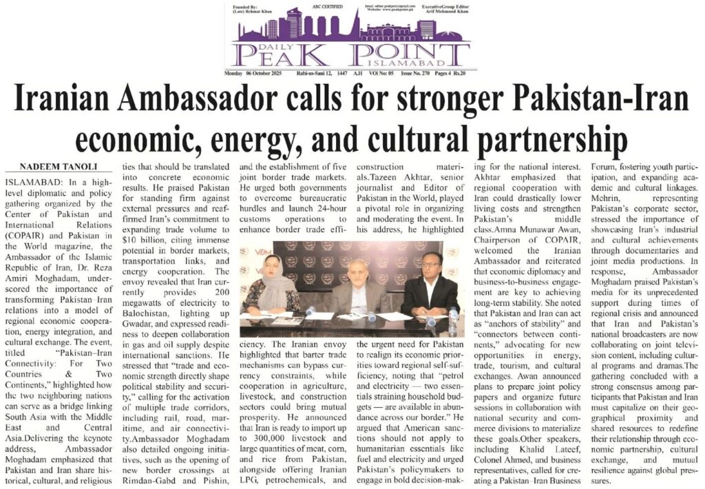 اسلام آباد، پاکستان: ایران کے سفیر، ڈاکٹر رضا امیری مقدم نے اسلام آباد میں منعقدہ اعلیٰ سطحی سفارتی اور پالیسی اجلاس میں پاکستان اور ایران کے تعلقات کو خطے میں اقتصادی تعاون، توانائی انضمام اور ثقافتی تبادلے کے ماڈل میں بدلنے پر زور دیا۔ یہ تقریب "Pakistan–Iran Connectivity: For Two Countries & Two Continents” کے عنوان سے سینٹر آف پاکستان اینڈ انٹرنیشنل ریلیشنز (COPAIR) اور پاکستان ان دی ورلڈ میگزین کی جانب سے منعقد کی گئی۔