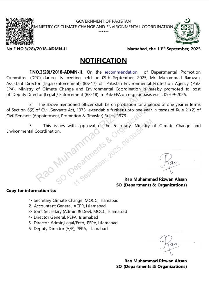 یہ نوٹیفکیشن سیکشن آفیسر راؤ محمد رضوان احسن کی جانب سے جاری کیا گیا اور اسے وزارت اور ایجنسی کے اہم افسران کو ارسال کیا گیا ہے، جن میں سیکریٹری ماحولیاتی تبدیلی، ڈائریکٹر جنرل پاک ای پی اے اور اکاؤنٹنٹ جنرل پاکستان ریونیو بھی شامل ہیں۔
