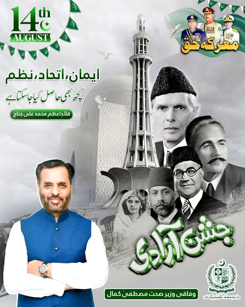 وفاقی وزیرِ صحت سید مصطفیٰ کمال نے یومِ آزادی کے موقع پر اپنے پیغام میں قوم کو مبارکباد پیش کی ہے اور اس دن کی اہمیت کو اجاگر کیا ہے۔ ان کا کہنا ہے کہ یومِ آزادی ہمیں ان قربانیوں اور جدوجہد کی یاد دلاتا ہے جن کے نتیجے میں پاکستان ایک آزاد ملک کی حیثیت سے قائم ہوا۔ انہوں نے کہا کہ پاکستان حق اور انصاف کی علامت ہے اور یہاں قومی وقار و عوامی فلاح کے تحفظ کا عزم سب پر مقدم ہے۔